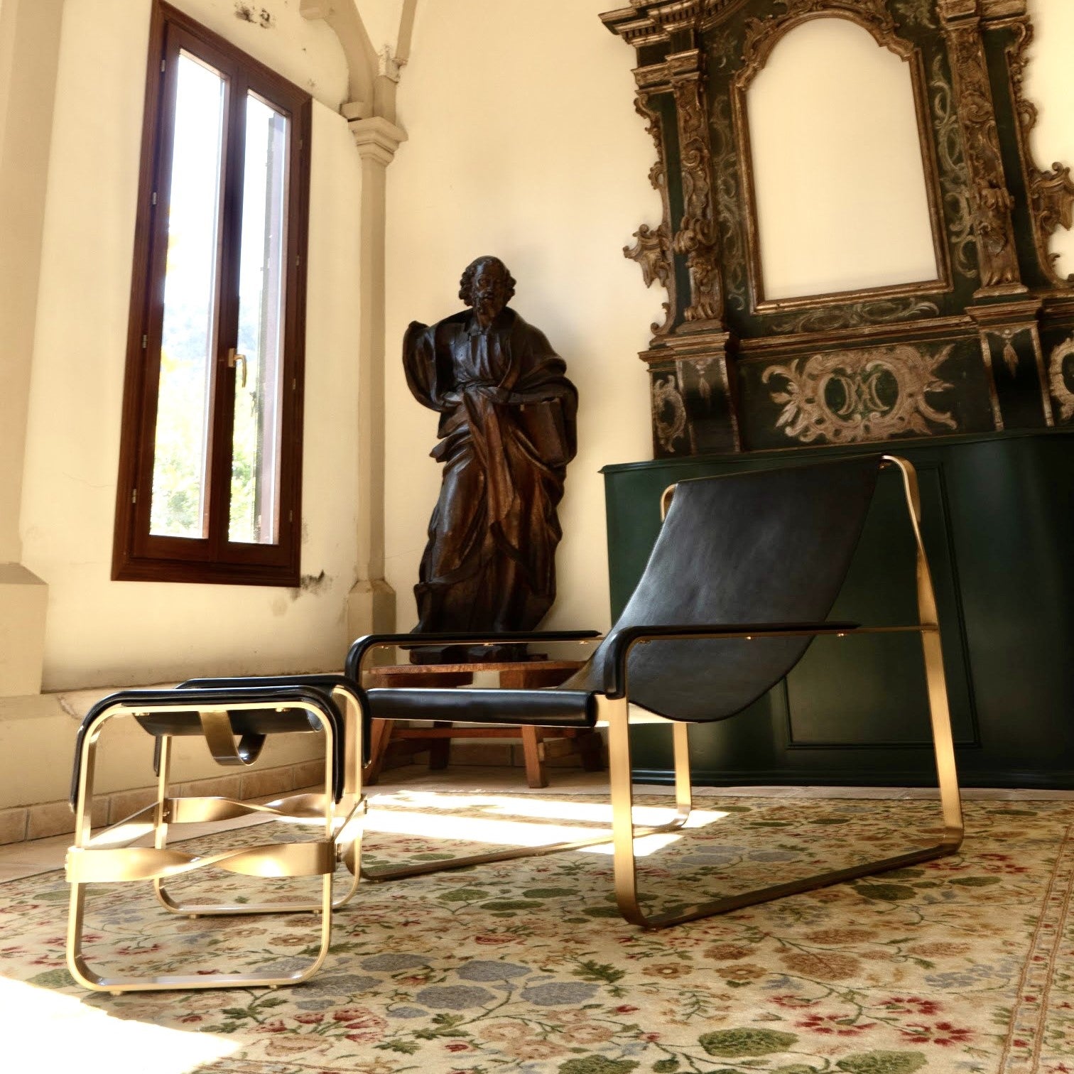 The chaise longue features a steel frame inspired by the 1920s Bauhaus designs. The flawless surface finish and exceptional durability are achieved through the precision molding of the steel using numerical control technology, followed by manual finishing in four stages: polishing, nickel plating, electrolytic color application, and matte lacquering. The premium cowhide leather, sourced as a byproduct of the food industry, undergoes a chrome-free, vegetable-tanning process. The leather parts are crafted with double hides, allowing for the inclusion of a cotton layer in the middle, while the leather edges are sanded, painted, and polished to achieve a luxuriously smooth finish. The incorporation of JoverValls' signature knurled brass screws adds a distinctive touch. The solid brass glides are fitted with a layer of natural leather at the bottom to prevent scratching of surfaces.