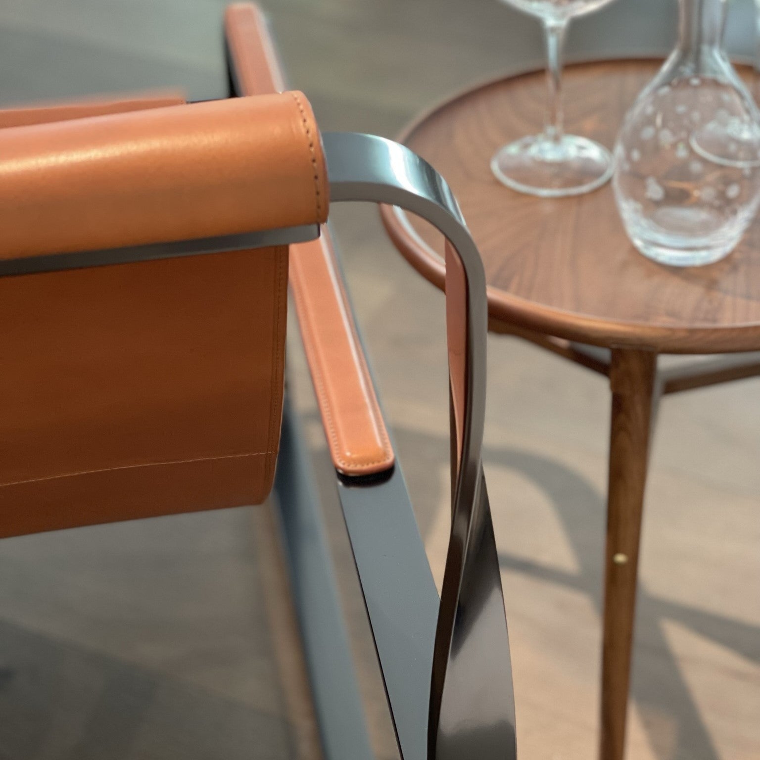 The Wanderlust Chaise Longue & Footstool distinguishes itself with a unique design and sturdy build. It not only adds a touch of sophistication to any space but is also versatile enough to enhance commercial settings like hotels, restaurants, and gardens. Moreover, it serves as a captivating statement piece in residential homes. Inspired by the timeless designs of Bauhaus and infused with the collective passions and expertise of its founders, the Wanderlust collection embodies a harmonious fusion of tradition and innovation. Merging the artistry of precision metalwork with the finesse of leather craftsmanship, it exudes sophistication and durability.